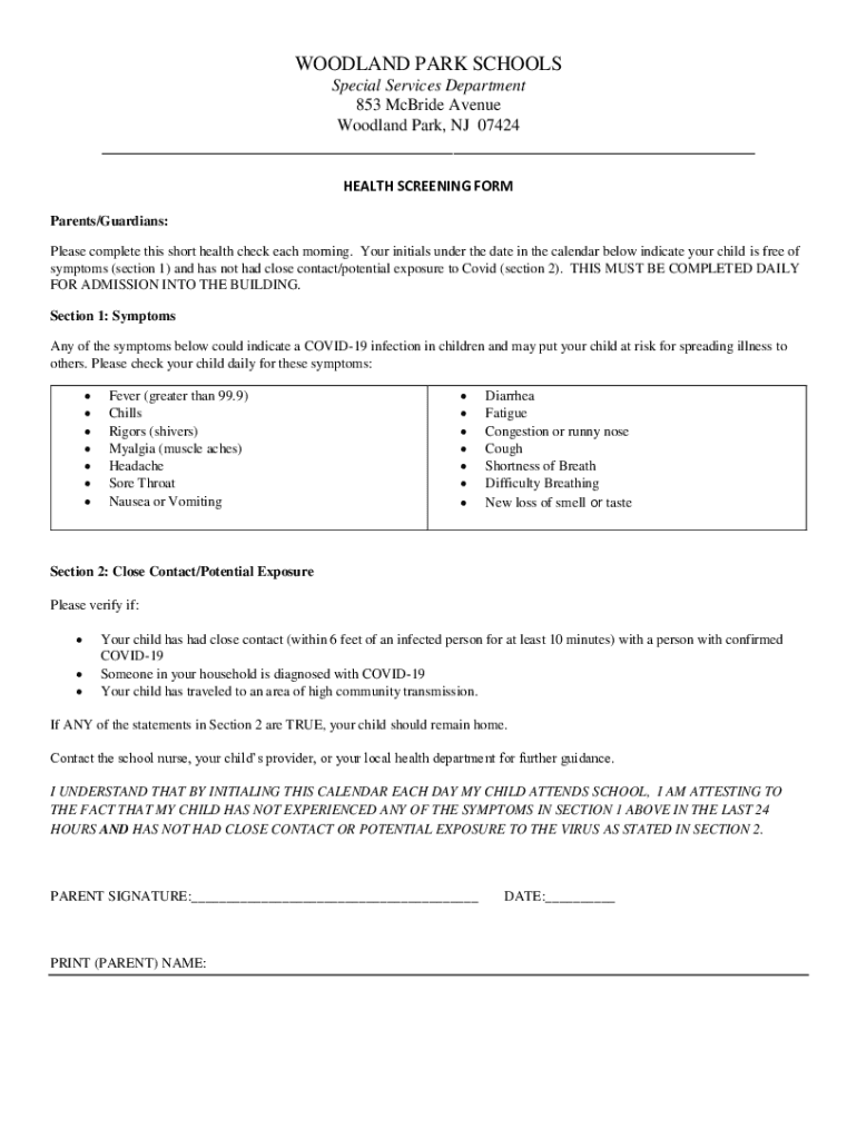 WOODLAND PARK SCHOOLS Special Services Department 853 McBride Avenue Woodland Park, NJ 07424 ___ HEALTH SCREENING FORM Parents/Guardians: Please complete this short health check each morning. Your