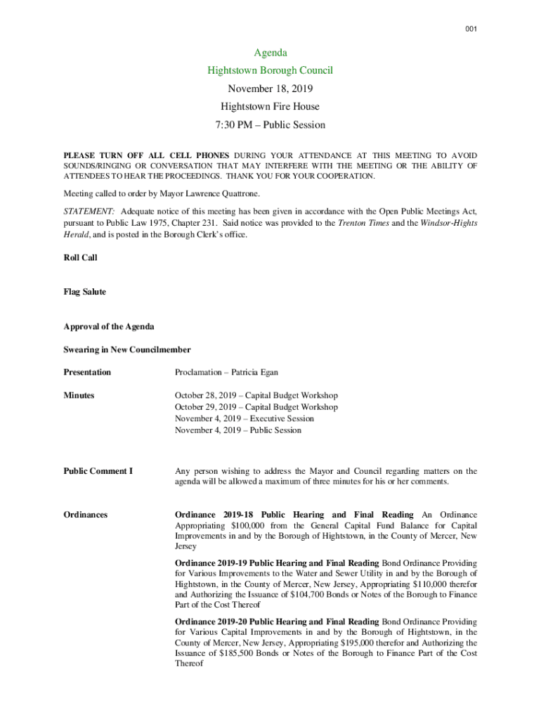 001Agenda Hightstown Borough Council November 18, 2019, Hightstown Fire House 7:30 PM Public Session PLEASE TURN OFF ALL CELL PHONES DURING YOUR ATTENDANCE AT THIS MEETING TO AVOID SOUNDS/RINGING
