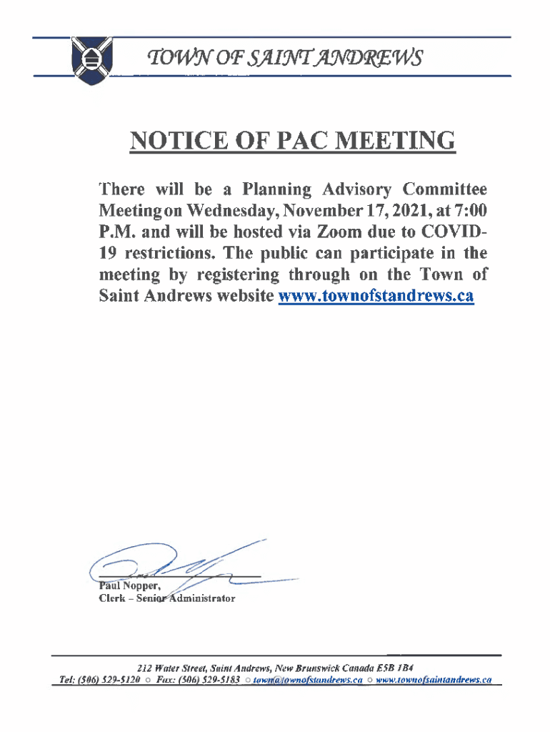 TOWN OF SAINT ANDREWS PLANNING ADVISORY COMMITTEE MEETING AGENDA November 17, 2021 7:00 p.m. Electronic Meeting Pages A.RECORD OF ATTENDANCE.APPROVAL OF AGENDA Recommended Motion: That the Agenda