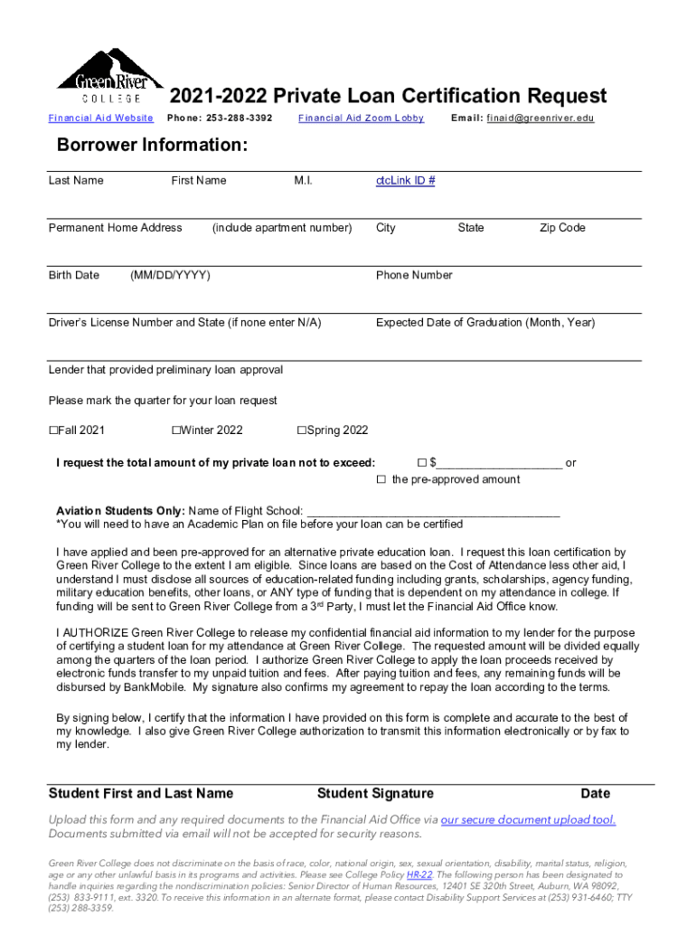 20212022 Private Loan Certification Request Financial Aid We Stephane: 253 28 83 392Financial Aid Zoom L obbyEmail: finaid@gre endive r.ed borrower Information: Last NameFirst Impermanent Home AddressBirth