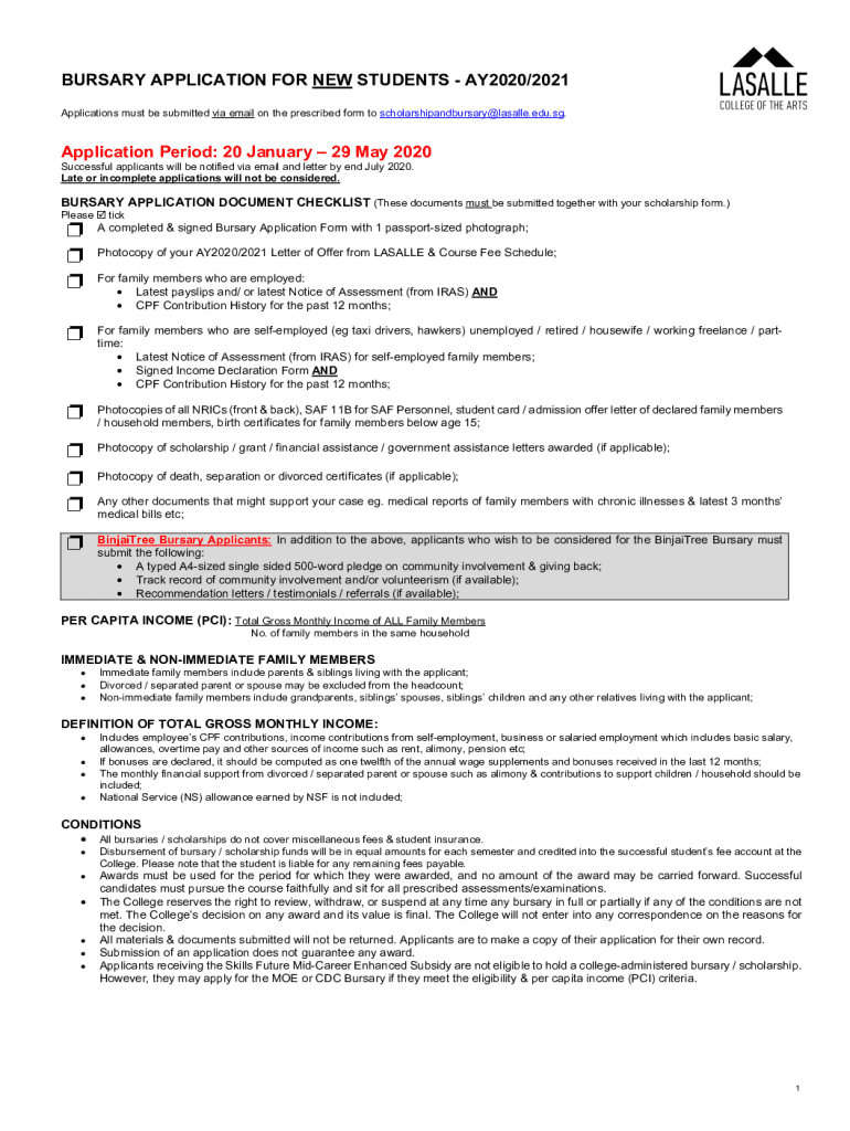BURSARY APPLICATION FOR NEW STUDENTS AY2020/2021 Applications must be submitted via email on the prescribed form to scholarshipandbursary@lasalle.edu.sg. Application Period: 20 January 29 May 2020