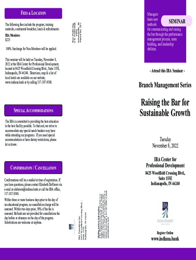 Fees & Location Nonprofit Org. U.S. POSTAGE PAID Indianapolis, IN Permit No. 221The following fees include the program, training materials, continental breakfast, lunch & refreshments: IBA Members