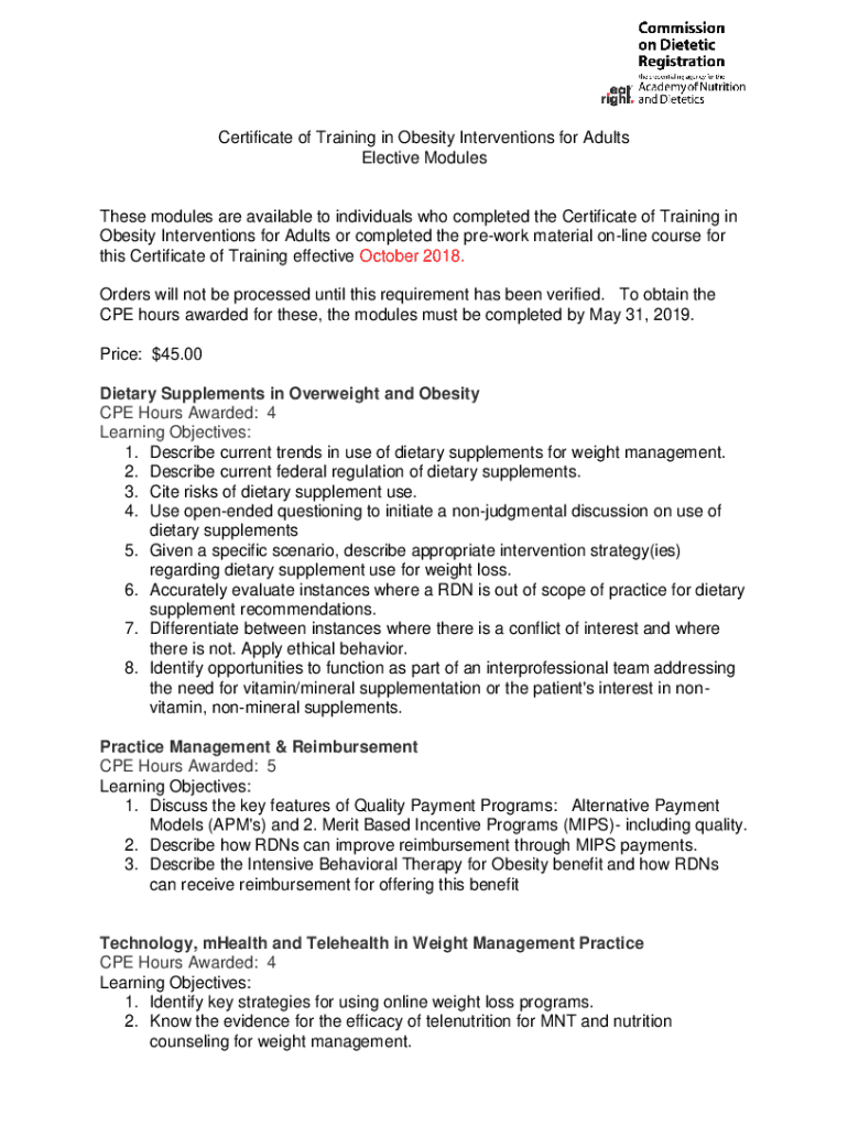 Certificate of Training in Obesity Interventions for Adults Elective ModulesThese modules are available to individuals who completed the Certificate of Training in Obesity Interventions for Adults