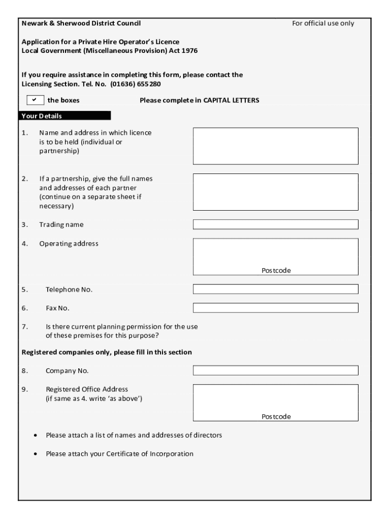 Newark & Sherwood District Councilor official use onlyApplication for a Private Hire Operators License Local Government (Miscellaneous Provision) Act 1976 If you require assistance in completing this