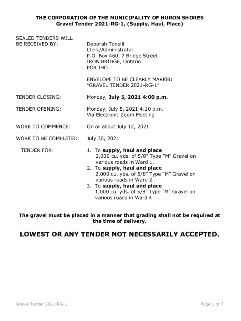 THE CORPORATION OF THE MUNICIPALITY OF HURON SHORES Gravel Tender 2021RG1, (Supply, Haul, Place) SEALED TENDERS WILL BE RECEIVED BY:Deborah Tonally Clerk/Administrator P.O. Box 460, 7 Bridge Street