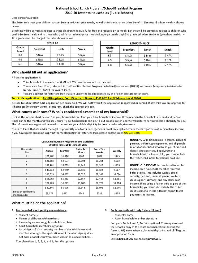 National School Lunch Program/School Breakfast Program 201920 Letter to Households (Public Schools) Dear Parent/Guardian: This letter tells how your children can get free or reduced price meals, as