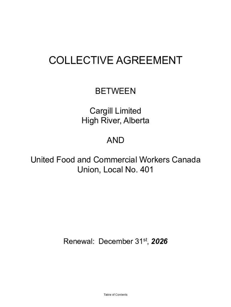 COLLECTIVE AGREEMENT BETWEEN Cargill Limited High River, Alberta AND United Food and Commercial Workers Canada Union, Local No. 401Renewal: December 31st, 2026Table of ContentsArticle 1 2 3 4 5 6