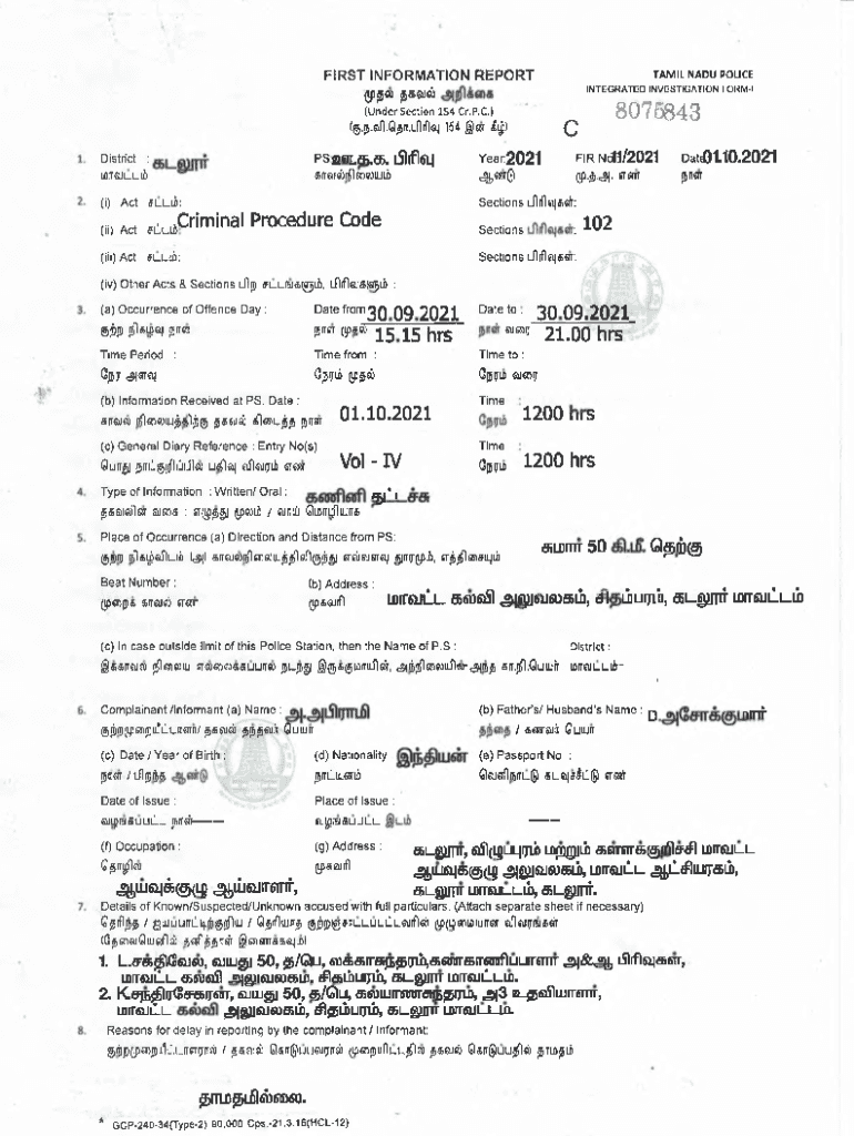 FIRST INFORMATION Report a mil n a d u p o l IC ESP? 0) jSSCUdtDistrict :