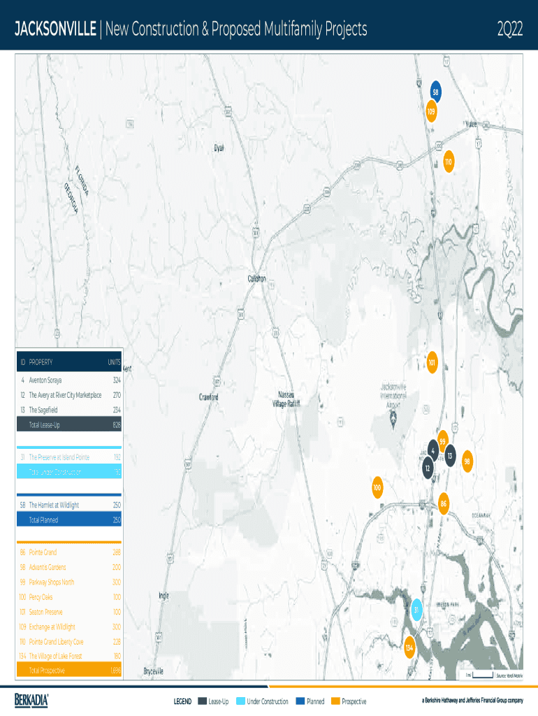 JACKSONVILLE | New Construction & Proposed Multifamily Projects2Q22 58 109110IDPROPERTY4Aventon Soraya32412The Avery at River City Marketplace27013The Sagefield234Total LeaseUp82831UNITSThe Preserve