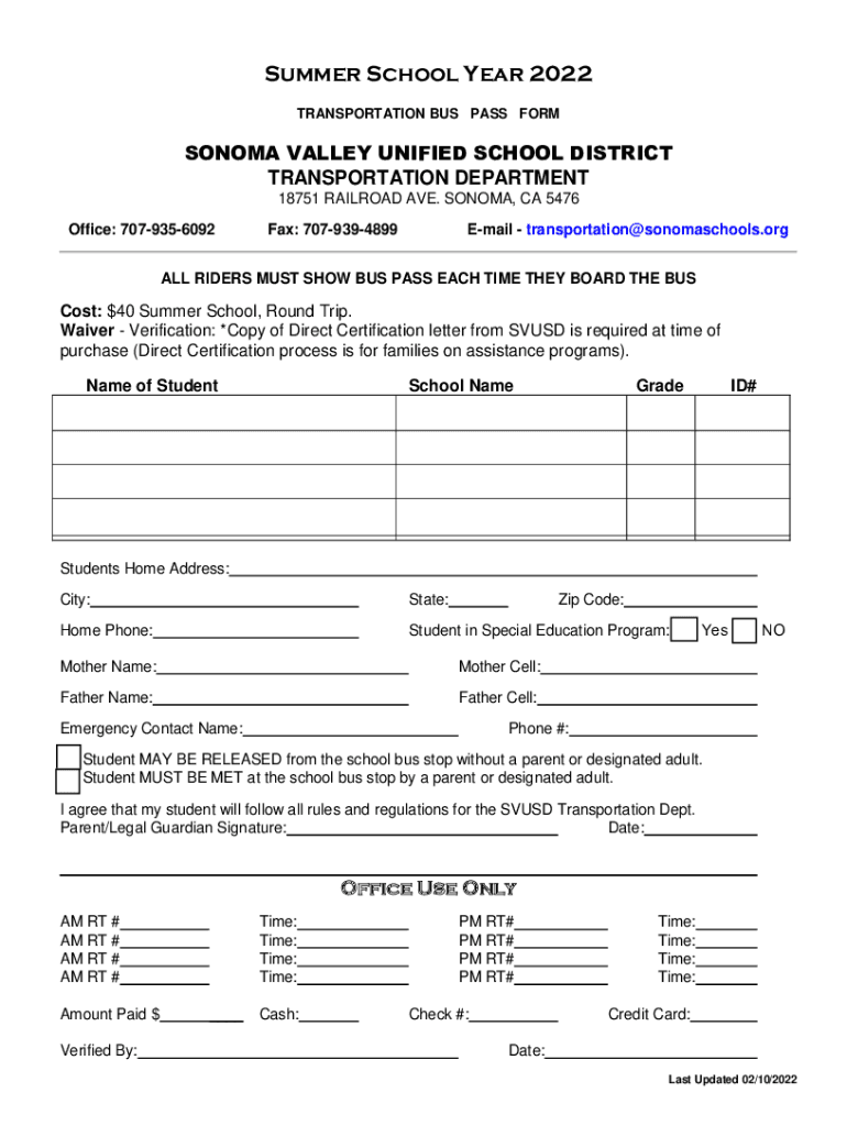 Summer School Year 2022 TRANSPORTATION BUS PASS FORMSONOMA VALLEY UNIFIED SCHOOL DISTRICT TRANSPORTATION DEPARTMENT 18751 RAILROAD AVE. SONOMA, CA 5476 Office: 7079356092Fax: 7079394899Email transportation@sonomaschools.orgALL