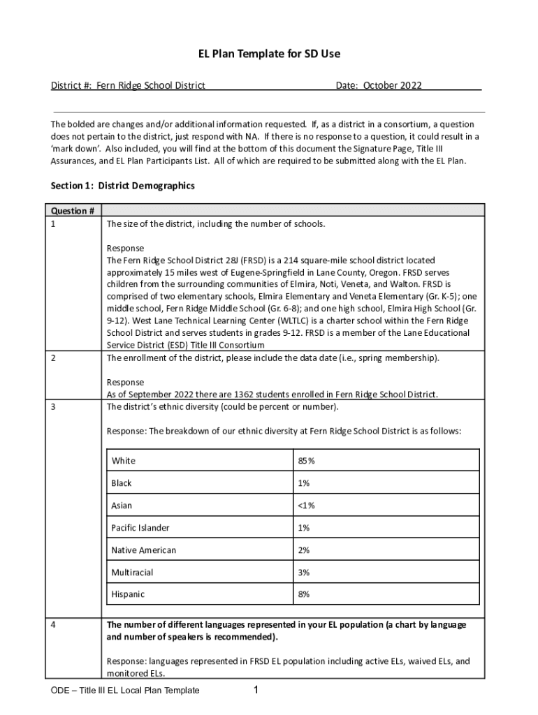EL Plan Template for SD Use District #: Fern Ridge School DistrictDate: October 2022The bolded are changes and/or additional information requested. If, as a district in a consortium, a question does