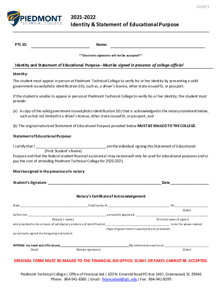 IDENTY20212022 Identity & Statement of Educational Purpose PTC ID:Name: **Electronic signatures will not be accepted**Identity and Statement of Educational Purposes be signed in presence of college