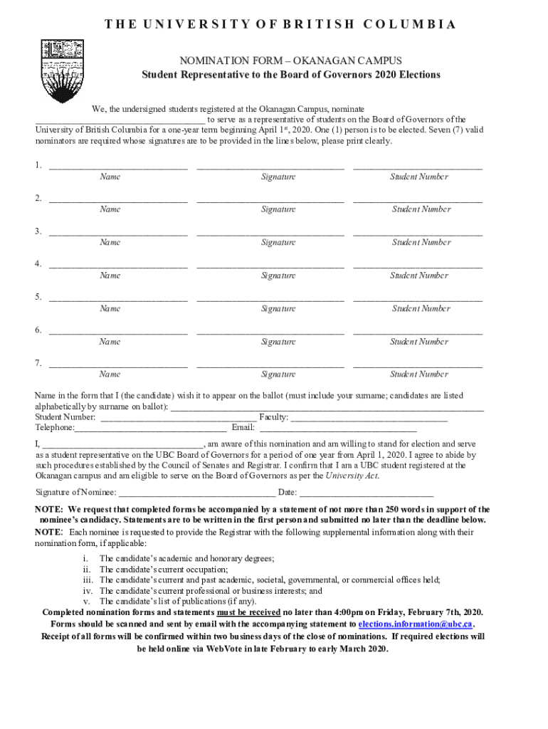 THE UNIVERSITY OF BRITISH COLUMBIA NOMINATION FORM FLANAGAN CAMPUS Student Representative to the Board of Governors 2020 Elections We, the undersigned students registered at the Flanagan Campus, nominate