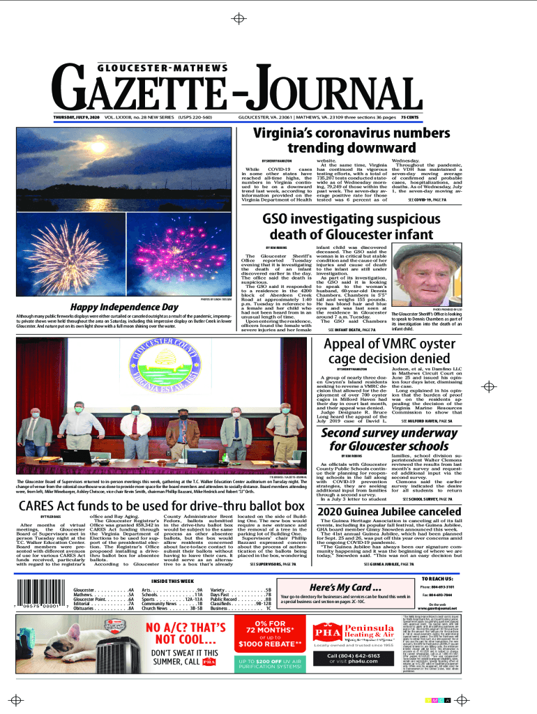 G L O U C E S T E R M AT H E W THURSDAY, JULY 9, 2020, VOL. XXXIII, no. 28 NEW SERIES (USPS 220560)GLOUCESTER, VA. 23061 | MATHEWS, VA. 23109 three sections 36 pages 75 CENTSVirginias coronavirus