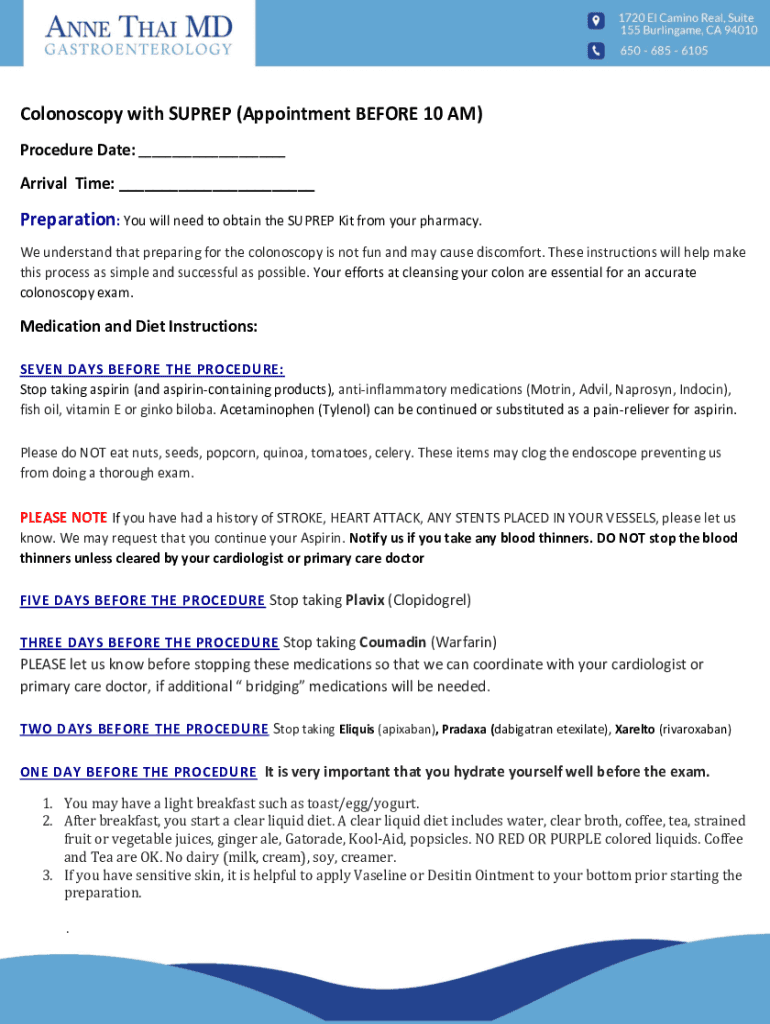 [Type here]Colonoscopy with SUP REP (Appointment BEFORE 10 AM) Procedure Date: ___ Arrival Time: ___Preparation: You will need to obtain the SUP REP Kit from your pharmacy. We understand that preparing