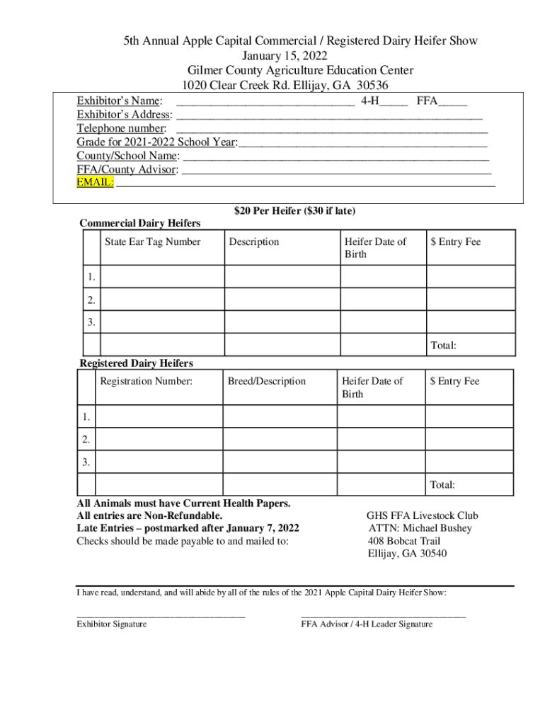 5th Annual Apple Capital Commercial / Registered Dairy Heifer Show January 15, 2022, Gilmer County Agriculture Education Center 1020 Clear Creek Rd. Elijah, GA 30536 Exhibitors Name: ___ 4H___ FFA___