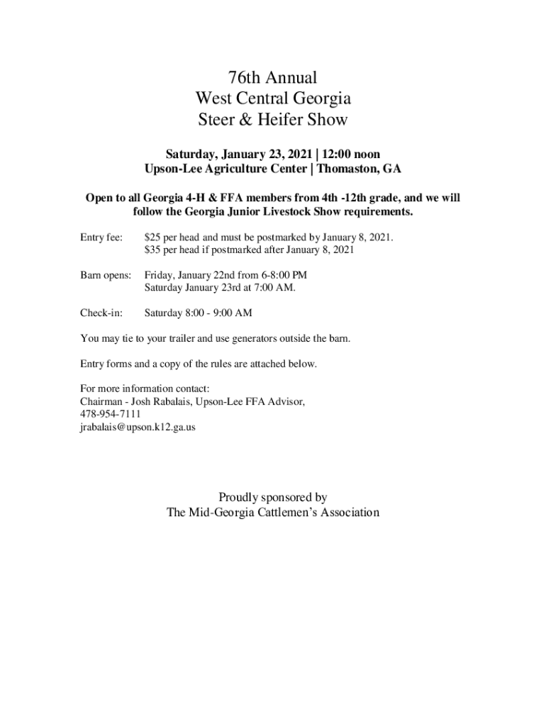 76th Annual West Central Georgia Steer & Heifer Show Saturday, January 23, 2021 | 12:00 noon Upscale Agriculture Center | Thomaston, GA Open to all Georgia 4H & FFA members from 4th 12th grade, and