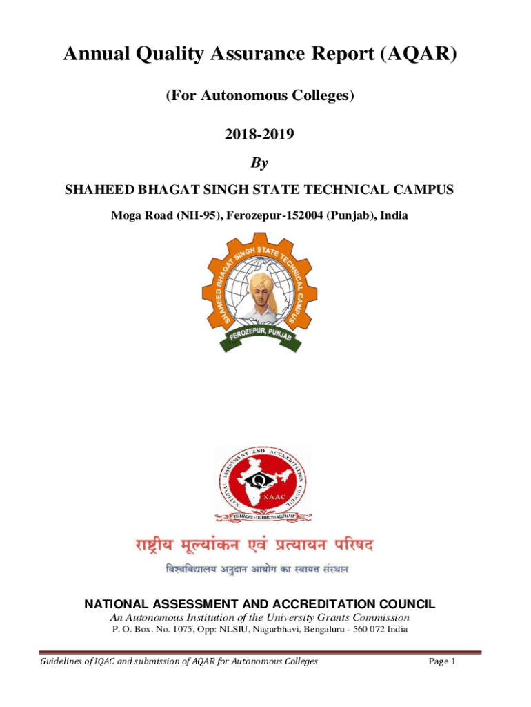 Annual Quality Assurance Report (AGAR) (For Autonomous Colleges) 20182019 By SHAHEED BHARAT SINGH STATE TECHNICAL CAMPUS Yoga Road (NH95), Ferozepur152004 (Punjab), Intranational ASSESSMENT AND ACCREDITATION