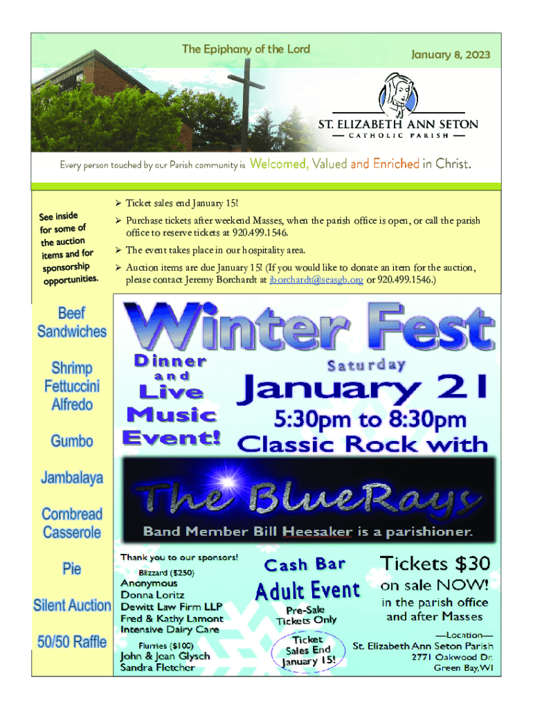 The Epiphany of the Lord January 8, 2023, Ticket sales end January 15! Purchase tickets after weekend Masses, when the parish office is open, or call the parish office to reserve tickets at 920.499.1546.