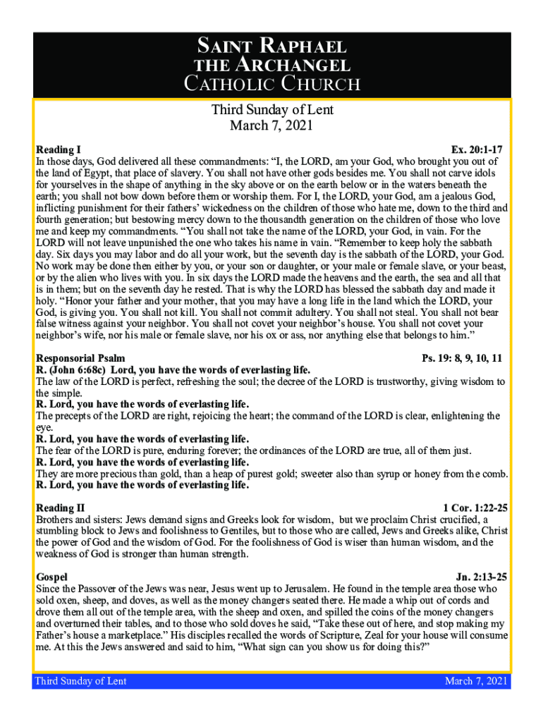 S CAR Third Sunday of Lent March 7, 2021, Reading I Ex. 20:117 In those days, God delivered all these commandments: I, the LORD, am your God, who brought you out of the land of Egypt, that place of