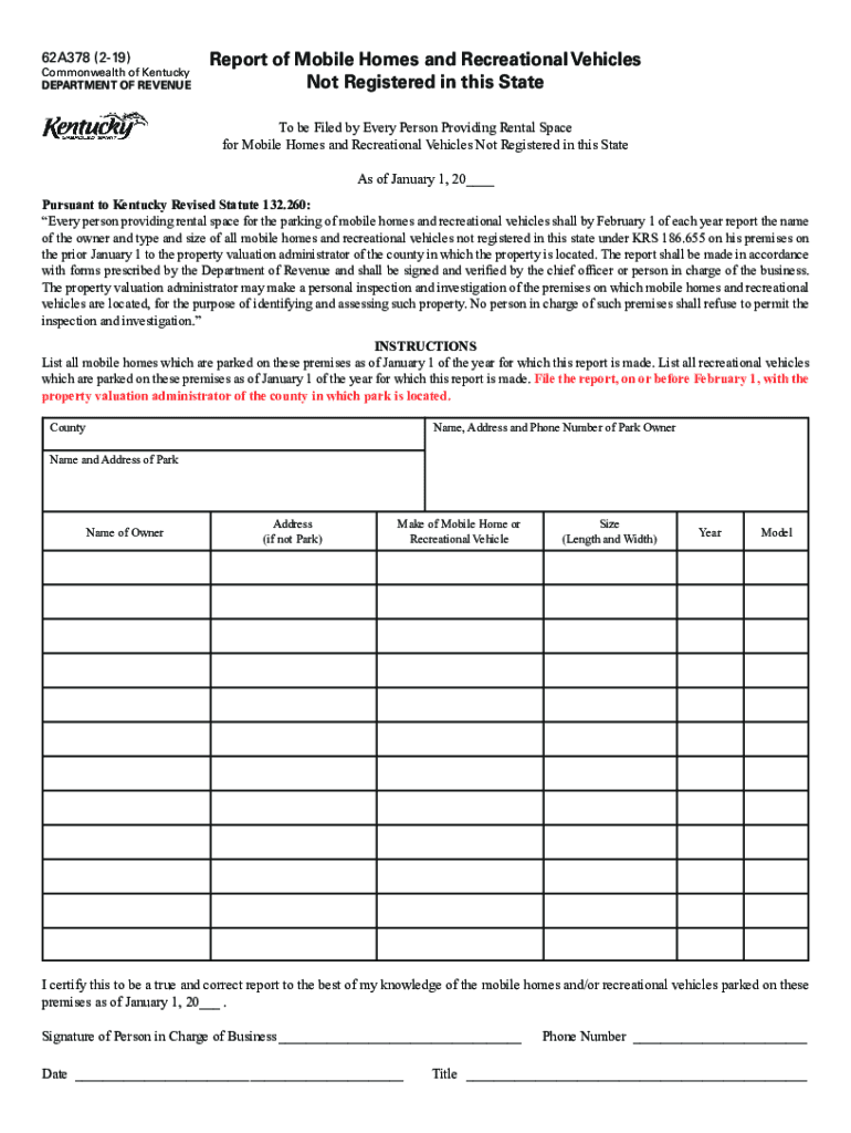 62A378 (219)Commonwealth of Kentucky DEPARTMENT OF REVENUEReport of Mobile Homes and Recreational Vehicles Not Registered in this State To be Filed by Every Person Providing Rental Space for Mobile