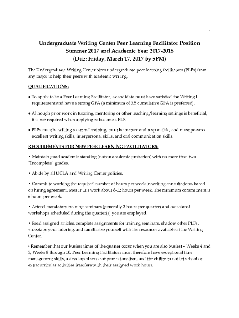 1Undergraduate Writing Center Peer Learning Facilitator Position Summer 2017 and Academic Year 20172018 (Due: Friday, March 17, 2017, by 5PM) The Undergraduate Writing Center hires undergraduate peer