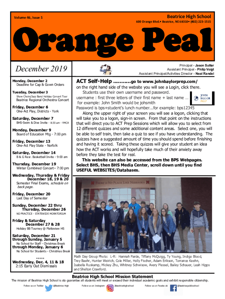 Beatrice High Schoolhouse 46, Issue 5Orange Peal 600 Orange Blvd. Beatrice, NE 68310 (402) 2231515Principal Jason Sutter Assistant Principal Philip Vogt Assistant Principal/Activities Director Neal