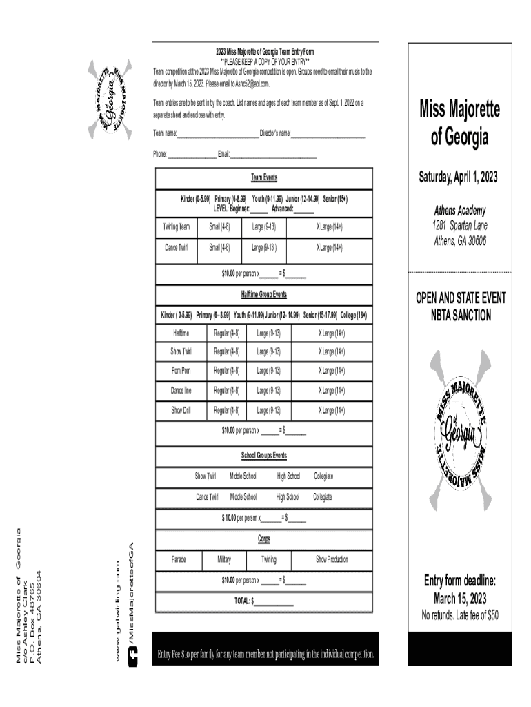 2023 Miss Majorette of Georgia Team Entry Form **PLEASE KEEP A COPY OF YOUR ENTRY** Team competition at the 2023 Miss Majorette of Georgia competition is open. Groups need to email their music to