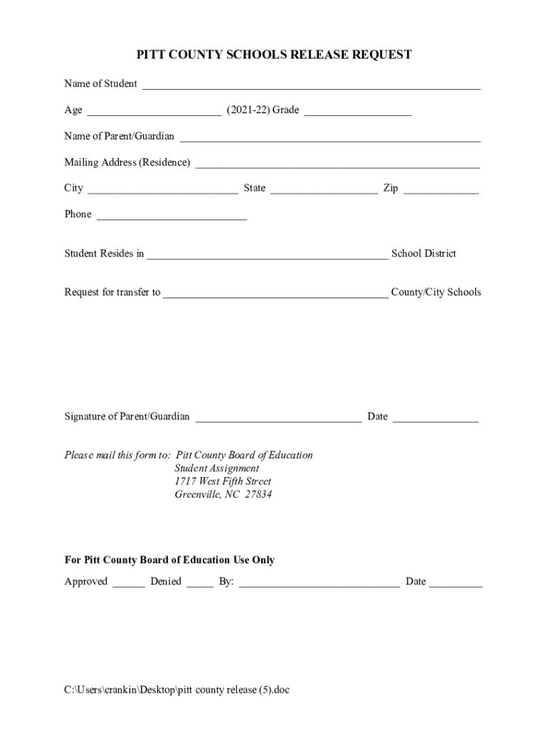 PITT COUNTY SCHOOLS RELEASE REQUEST Name of Student ___ Age ___ (202122) Grade ___ Name of Parent/Guardian ___ Mailing Address (Residence) ___ City ___ State ___ Zip ___ Phone ___ Student Resides