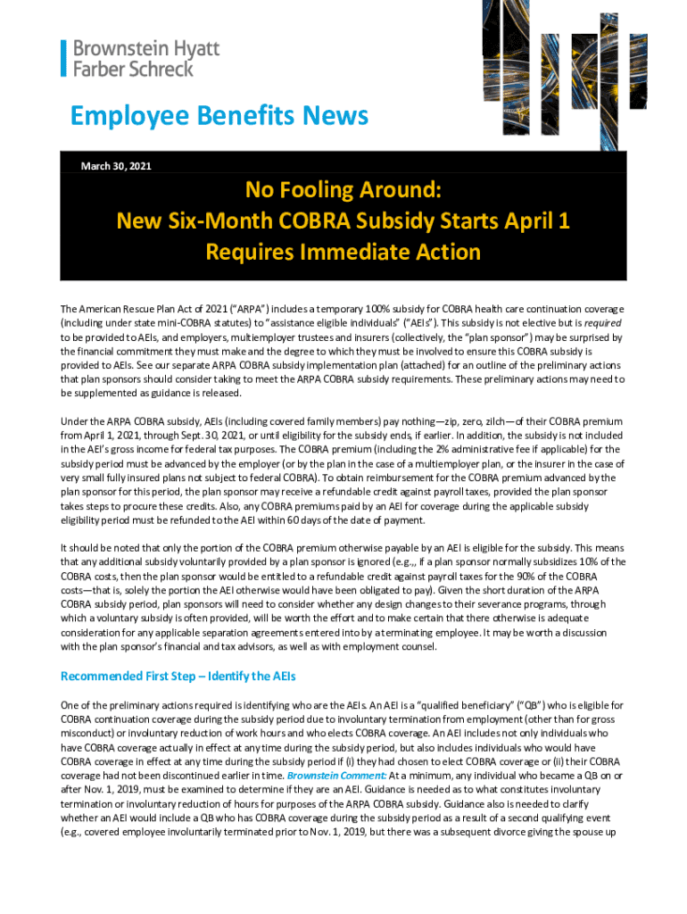 Employee Benefits News March 30, 2021No Fooling Around: New Month COBRA Subsidy Starts April 1 Requires Immediate Action The American Rescue Plan Act of 2021 (ARPA) includes a temporary 100% subsidy