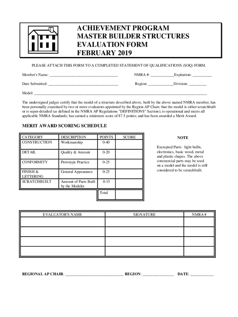 ACHIEVEMENT PROGRAM MASTER BUILDER STRUCTURES EVALUATION FORM FEBRUARY 2019 PLEASE ATTACH THIS FORM TO A COMPLETED STATEMENT OF QUALIFICATIONS (SO) FORM. Member\'s Name: ___NMRA #: ___Expiration: