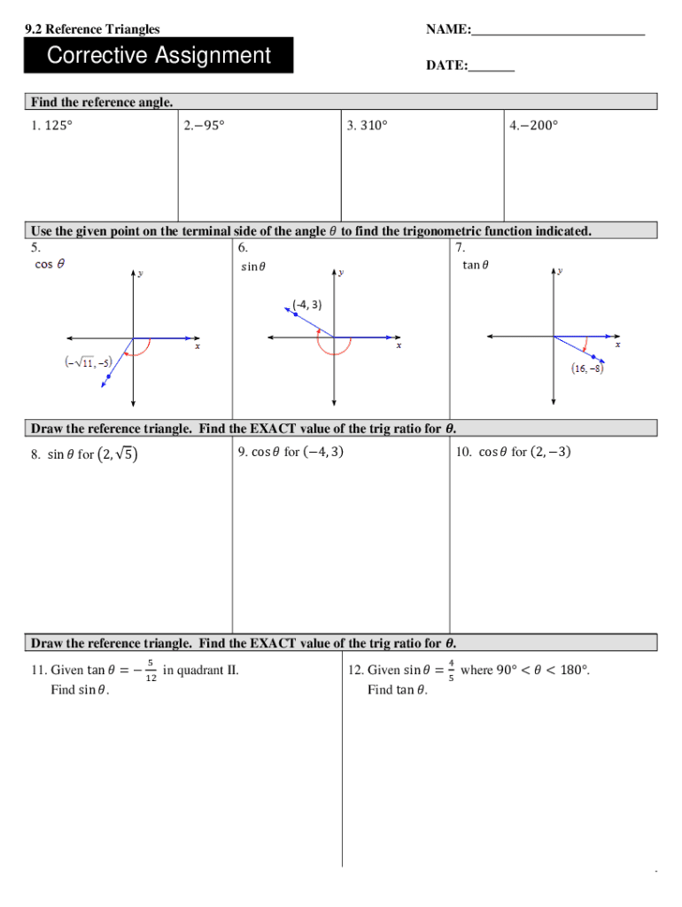 9.2 Reference TrianglesNAME:___Corrective AssignmentDATE:___Find the reference angle. 1. 1253. 3102.954.200Use the given point on the terminal side of the angle to find the trigonometric function