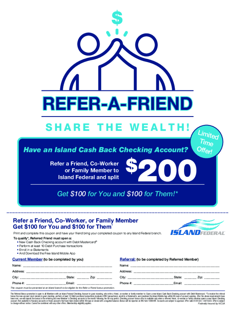 $REFERAFRIEND SHARE THE WEALTH! Have an Island Cash Back Checking Account? Refer a Friend, Coworker or Family Member to Island Federal and splitLimit ed Time Offer !$200Get $100 for You and $100 for