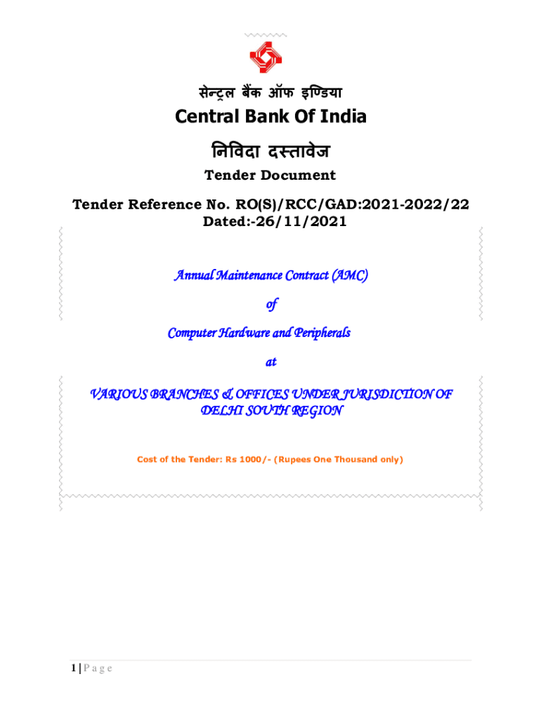 Central Bank Of India Tender Document Tender Reference No. RO(S)/RCC/GAD:20212022/22 Dated:26/11/2021Annual Maintenance Contract (AMC) of Computer Hardware and Peripherals at VARIOUS BRANCHES & OFFICES