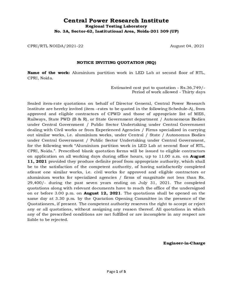 Central Power Research Institute Regional Testing Laboratory No. 3A, Sector62, Institutional Area, Noida201 309 (UP)CPI/RTL NOIDA/202122August 04, 2021NOTICE INVITING QUOTATION (IQ) Name of the work: