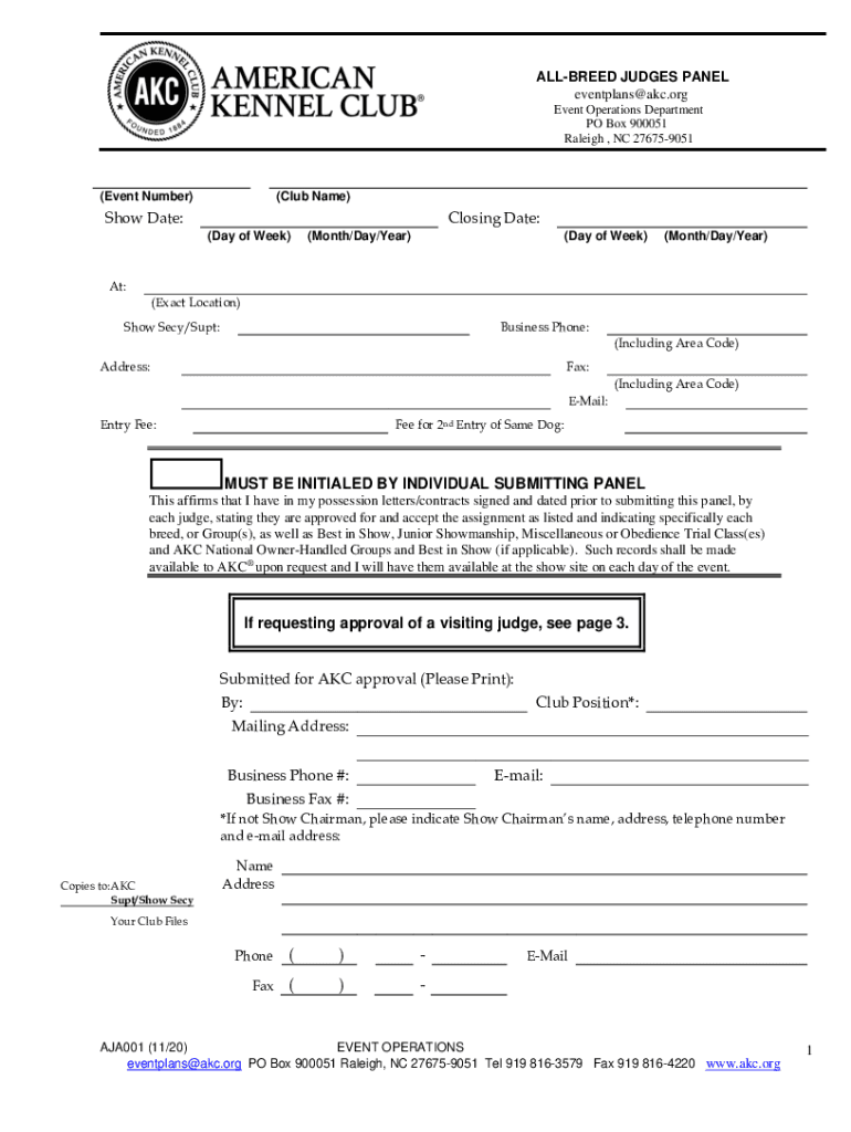 ALLURED JUDGES PANEL eventplans@akc.org Event Operations Department PO Box 900051 Raleigh, NC 276759051(Event Number)(Club Name)Show Date:Closing Date: (Day of Week)(Month/Day/Year)(Day of Week)(Month/Day/Year)At:
