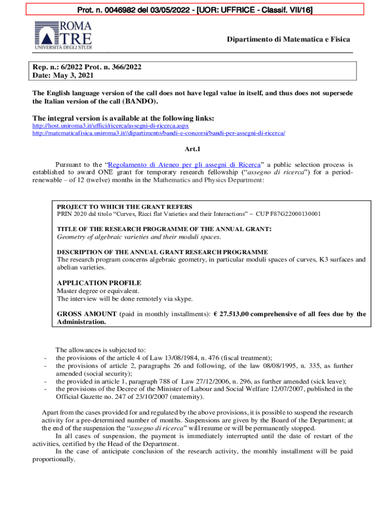 Plot. n. 0046982 Del 03/05/2022 [FOR: OFFICE Classic. VII/16]Divertimento DI Mathematical e Fishcake. n.: 6/2022 Plot. n. 366/2022 Date: May 3, 2021, The English language version of the call does