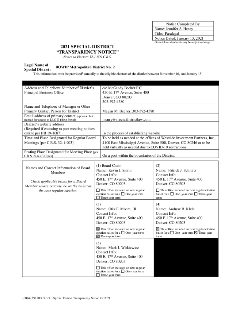 Notice Completed By Name: Jennifer S. Henry Title: Paralegal Notice Dated: January 13, 2021, Some information herein may be subject to change.2021 SPECIAL DISTRICT TRANSPARENCY NOTICE to Electors