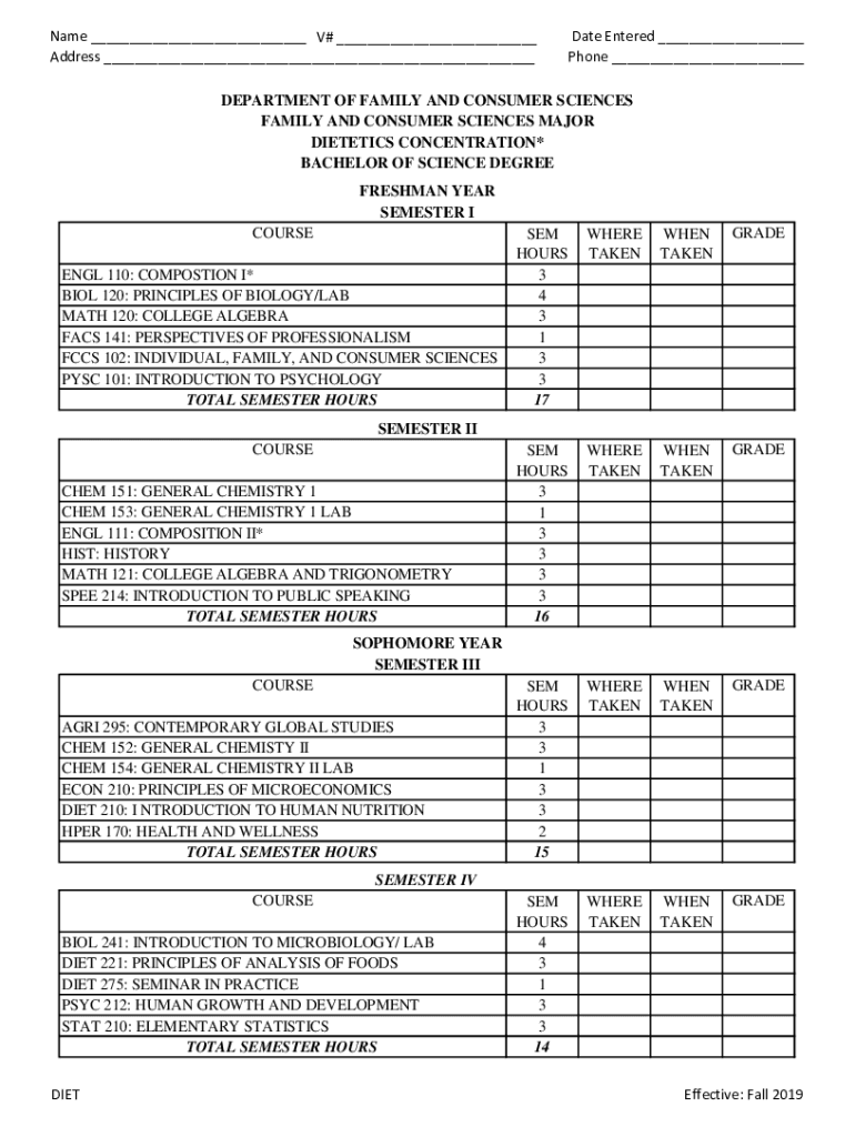 Name ___ V# ___ Address ___Date Entered ___ Phone ___DEPARTMENT OF FAMILY AND CONSUMER SCIENCES FAMILY AND CONSUMER SCIENCES MAJOR DIETETICS CONCENTRATION* BACHELOR OF SCIENCE DEGREE FRESHMAN YEAR