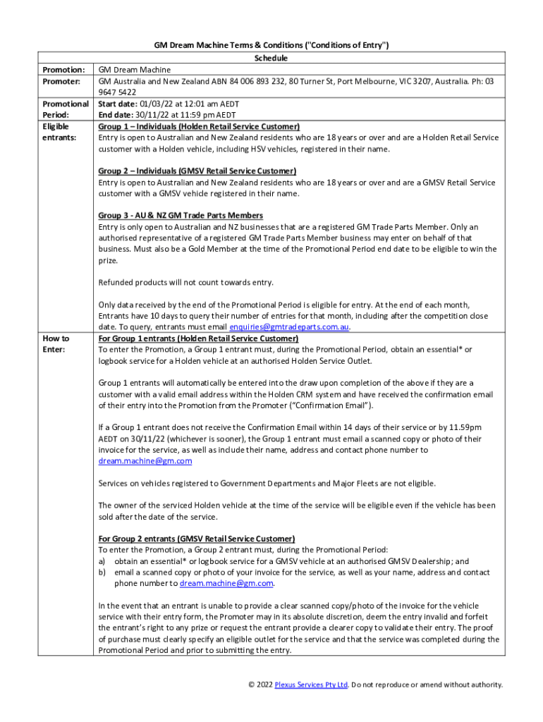 Promotion: Promoter: Promotional Period: Eligible entrants:GM Dream Machine Terms & Conditions (\” Conditions of Entry\”) Schedule GM Dream Machine GM Australia and New Zealand ABN 84 006 893