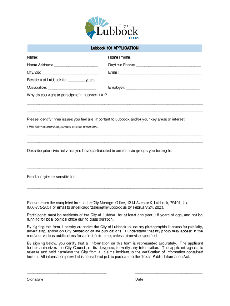 Name: ___Home Phone: ___Home Address: ___Daytime Phone: ___City/Zip: ___Email: ___Resident of Lubbock for ___ years Occupation: ___Employer: ___Why do you want to participate in Lubbock 101? ___ ___