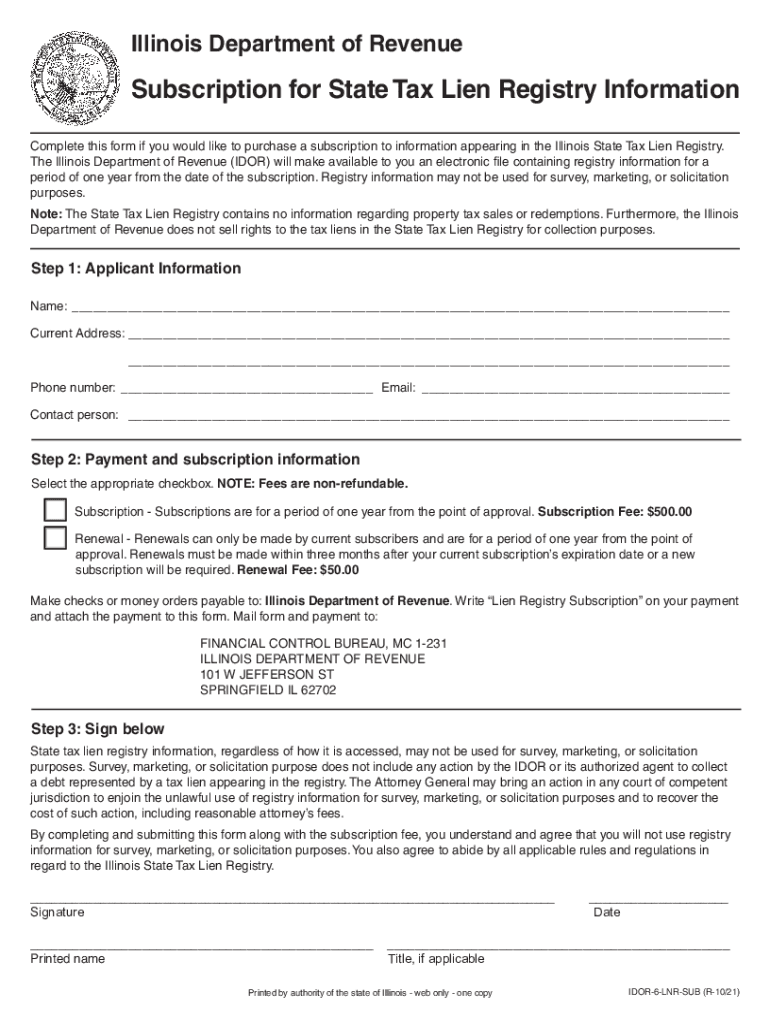 Illinois Department of RevenueSubscription for State Tax Lien Registry Information Complete this form if you would like to purchase a subscription to information appearing in the Illinois State Tax