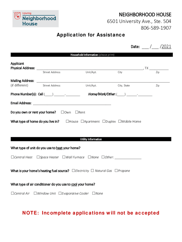 NEIGHBORHOOD HOUSE APPLICATION CHECKLIST