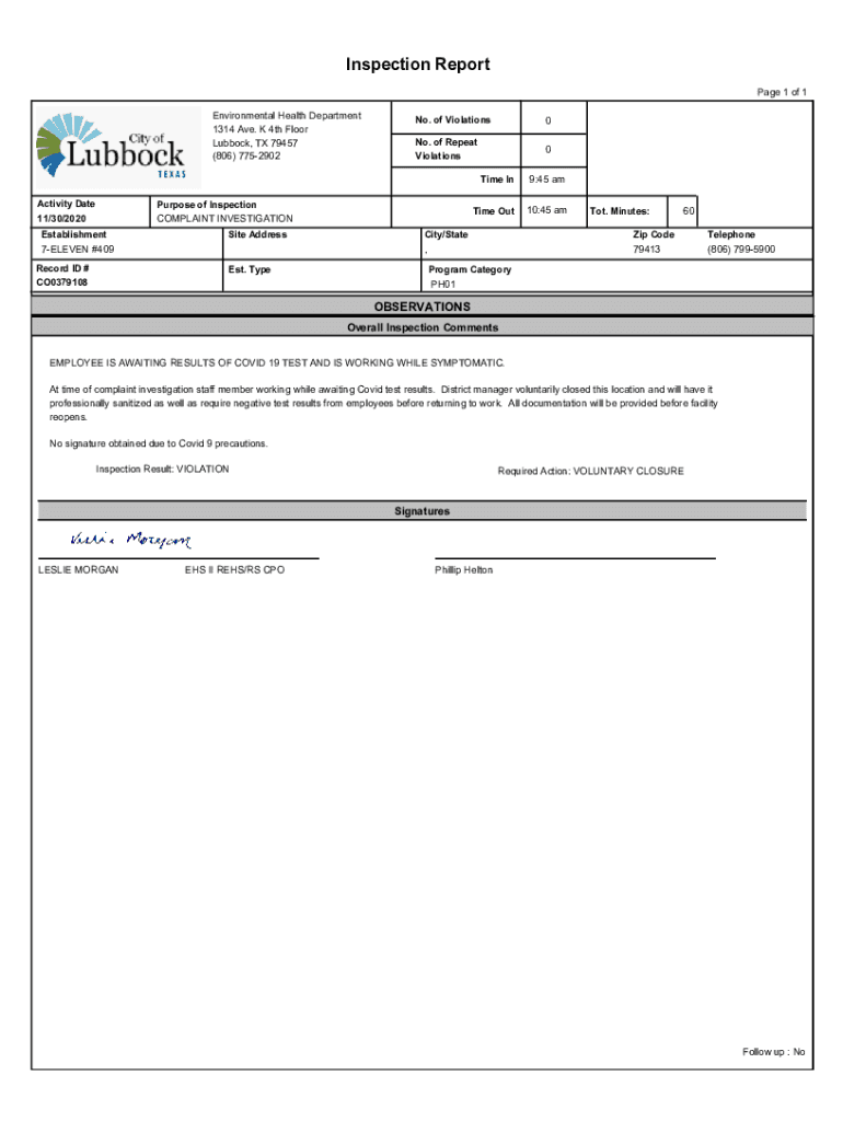 Inspection Report Page 1 of 1 Environmental Health Department 1314 Ave. K 4th Floor Lubbock, TX 79457 (806) 7752902Activity Date 11/30/2020No. Of Violations0No. Of Repeat Violations0Purpose of Inspection