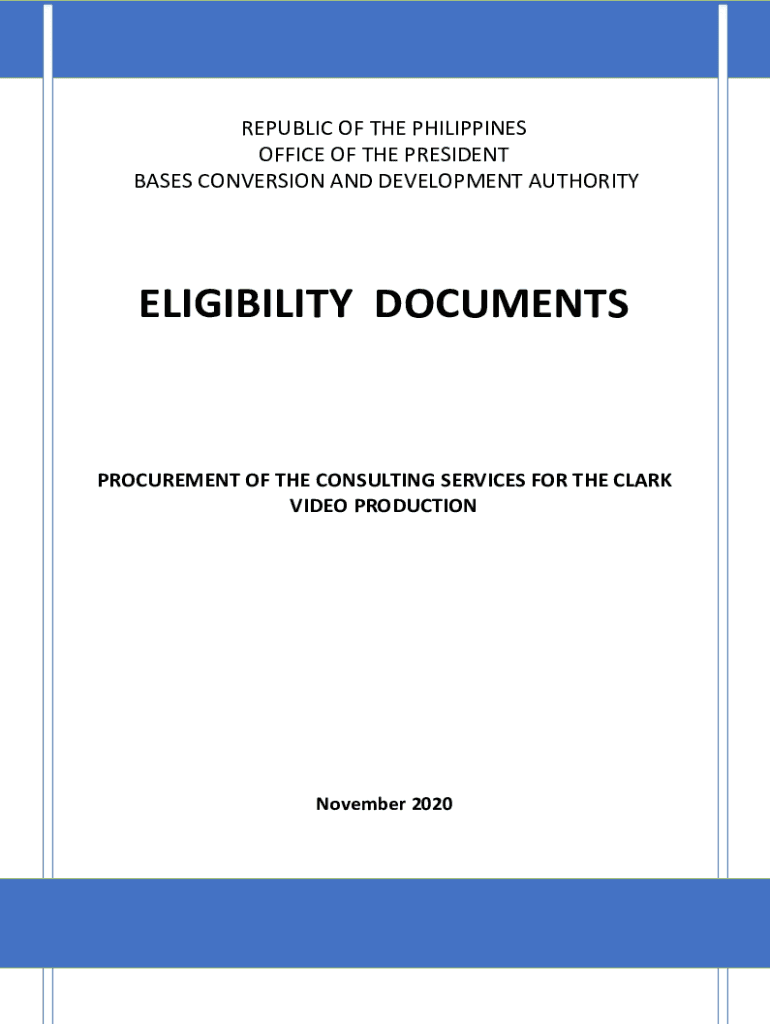 REPUBLIC OF THE PHILIPPINES OFFICE OF THE PRESIDENT BASES CONVERSION AND DEVELOPMENT AUTHORITYELIGIBILITY DOCUMENTSPROCUREMENT OF THE CONSULTING SERVICES FOR THE CLARK VIDEO PRODUCTION November 2020TABLE