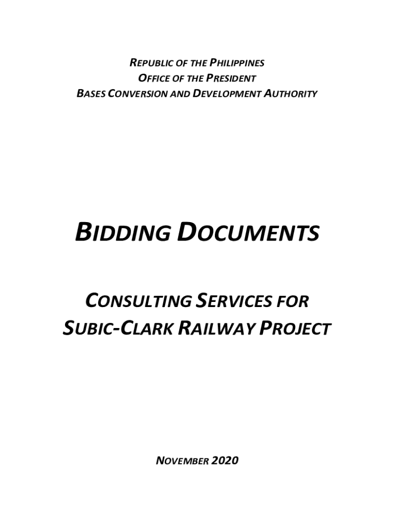 REPUBLIC OF THE PHILIPPINES OFFICE OF THE PRESIDENT BASES CONVERSION AND DEVELOPMENT AUTHORITYBIDDING DOCUMENTS CONSULTING SERVICES FOR SUBICCLARK RAILWAY PROJECTNOVEMBER 2020TABLE OF CONTENTS SECTION