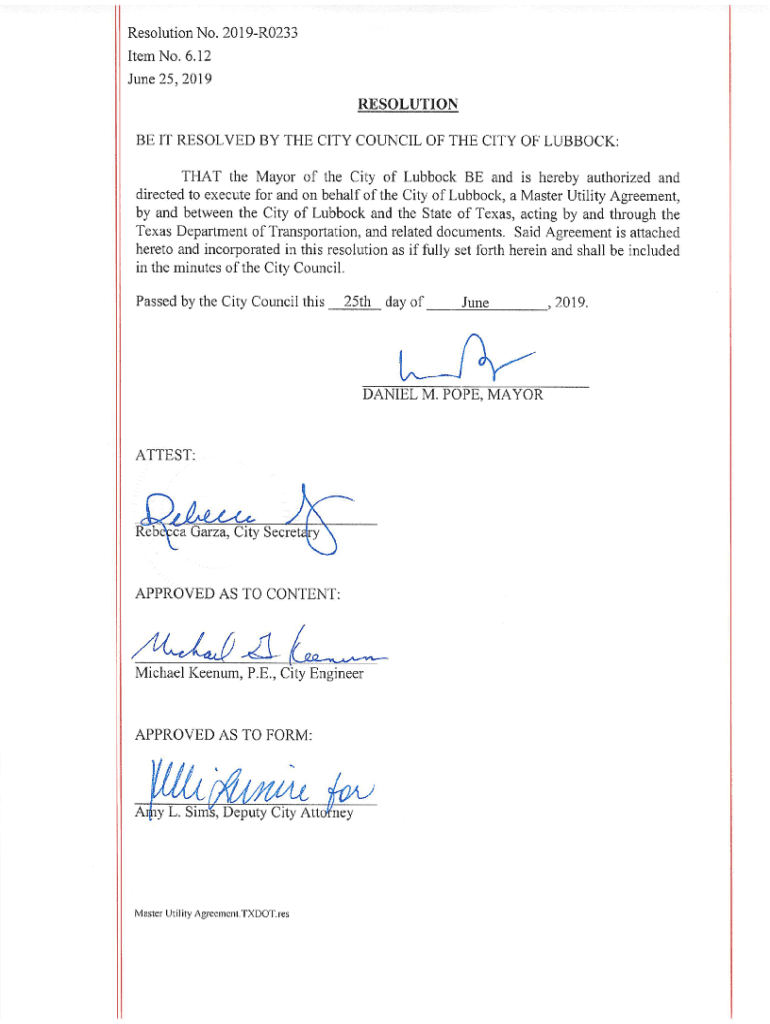 Resolution No. 2019 R0233 Item No. 6. 12 June 25, 2019RESOLUTIONBE IT RESOLVED BY TIME CITY COUNCIL OF THE CITY OF LUBBOCK:THAI\' the Mayor of the City of Lubbock BE and is hereby authorized and directed