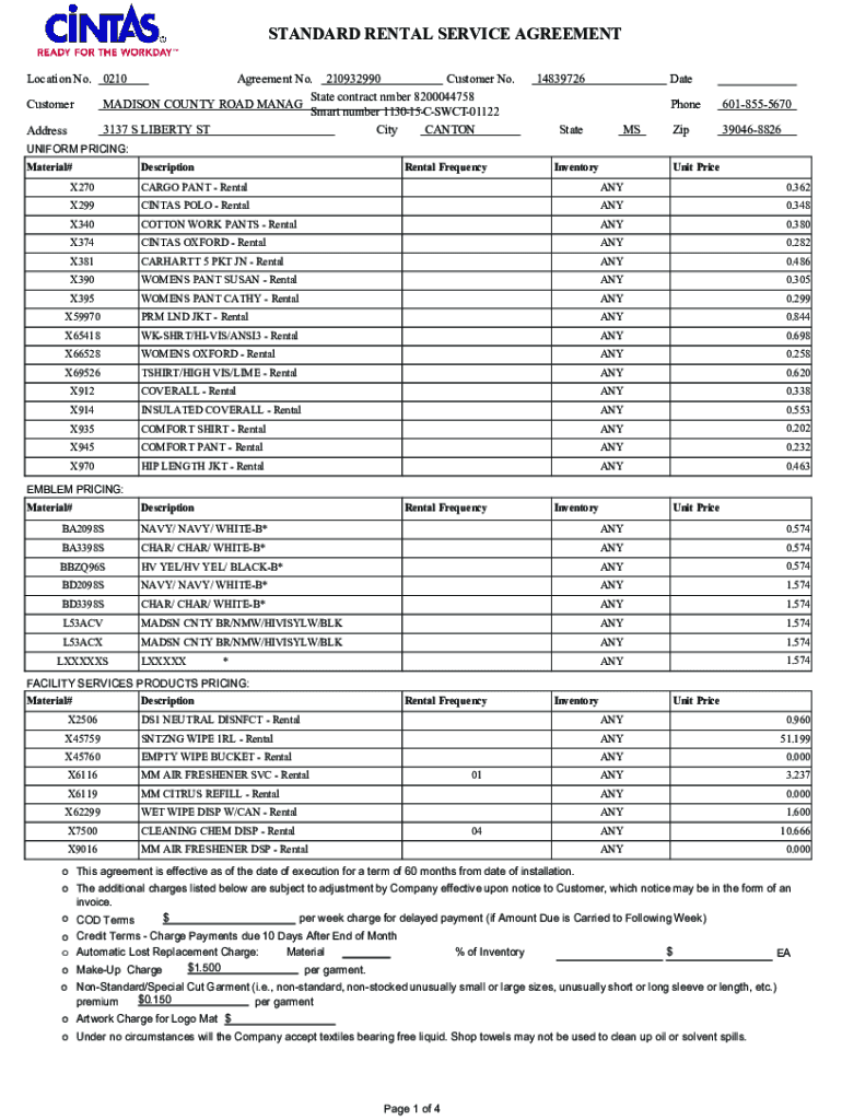 STANDARD RENTAL SERVICE AGREEMENT Customer No. Agreement No. 210932990 State contract number 8200044758 MADISON COUNTY ROAD MANAGE Smart number 113015CSWCT01122 3137 S LIBERTY ST CANTON Dislocation