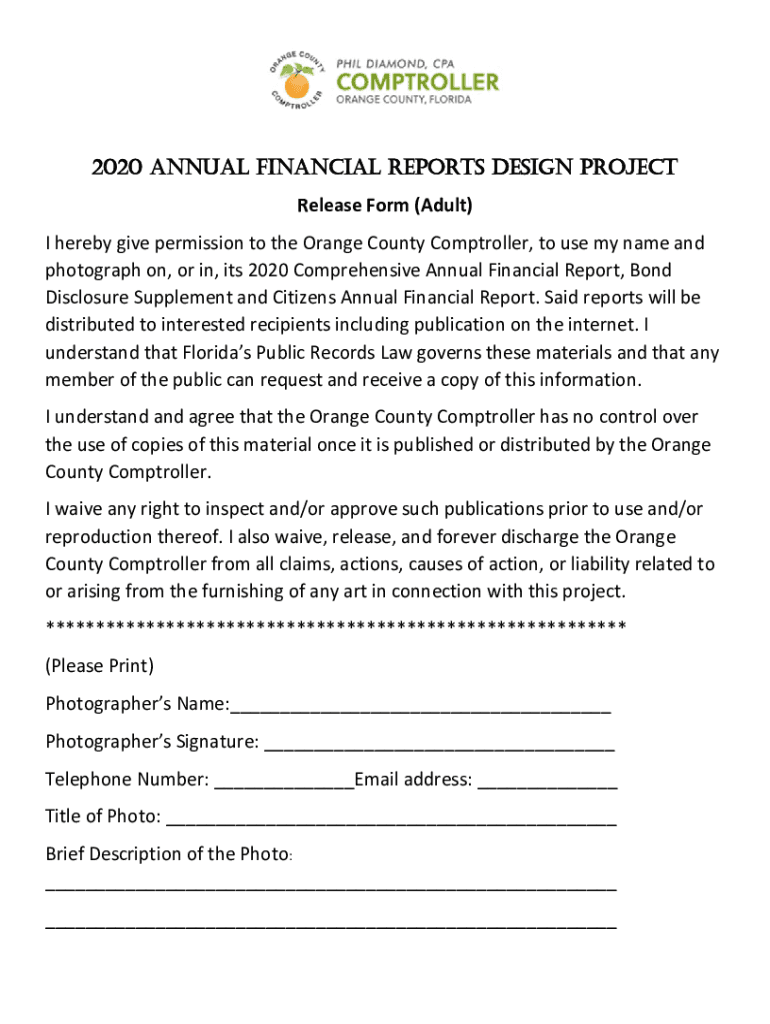 2020 ANNUAL FINANCIAL REPORTS DESIGN PROJECT Releaser(Adult) IherebygivepermissiontotheOrangeCountyComptroller, tousemynameand photograph on, Orin,its2020ComprehensiveAnnualFinancialReport,Bond DisclosureSupplementandCitizensAnnualFinancialReport.