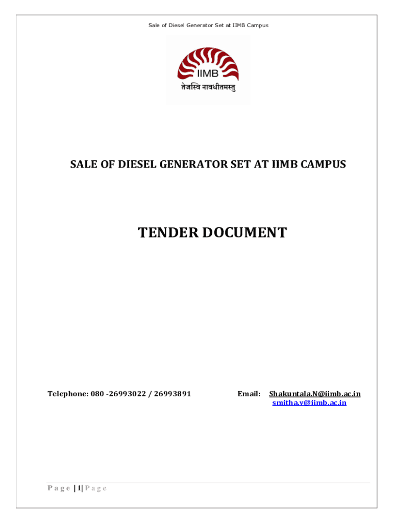 Sale of Diesel Generator Set at LIMB CampusSALE OF DIESEL GENERATOR SET AT LIMB CAMPUSTENDER DOCUMENTTelephone: 080 26993022 / 26993891P a g e | 1| P a g email:Shakuntala.N@iimb.ac.in